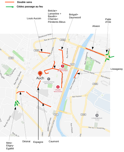 Lors d’un rendez-vous en décembre 2024, le Maire d’Auch nous a invité à lui faire passer des propositions sur la mise en place de nouveaux doubles sens cyclables et cédez le passage aux feux. Nous avons réalisé une enquête auprès de notre réseau pour collecter et prioriser des propositions que nous avons transmises au Maire et aux services techniques en janvier 2025.